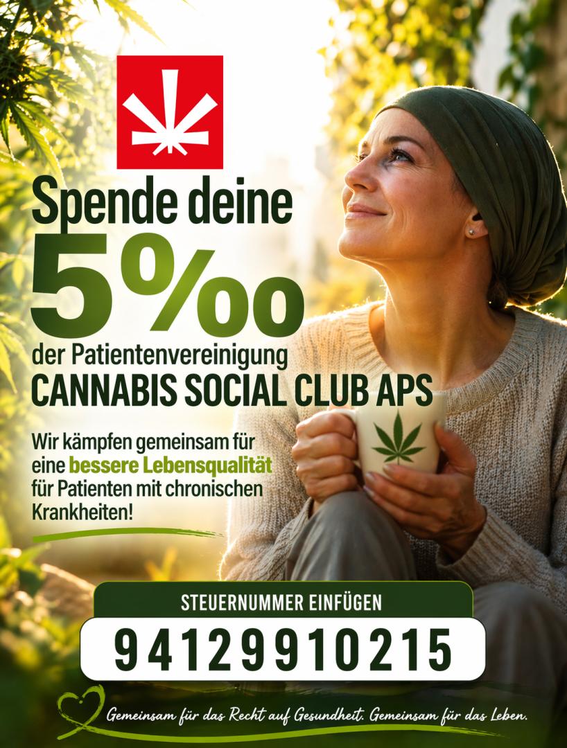 Lass die 5‰ deiner Einkommenssteuer der Patientenvereinigung Cannabis Social Club APS zukommen. Gib dafür die Steuernummer auf dem Steuervordruck CUD, 730 oder UNICO an: 94129910215